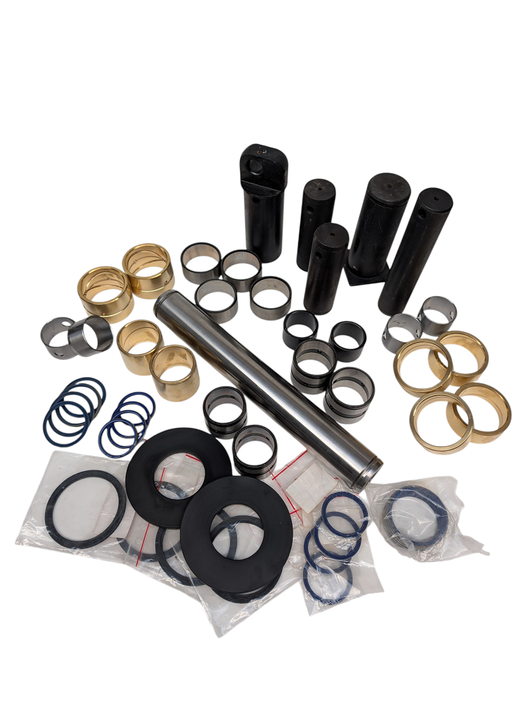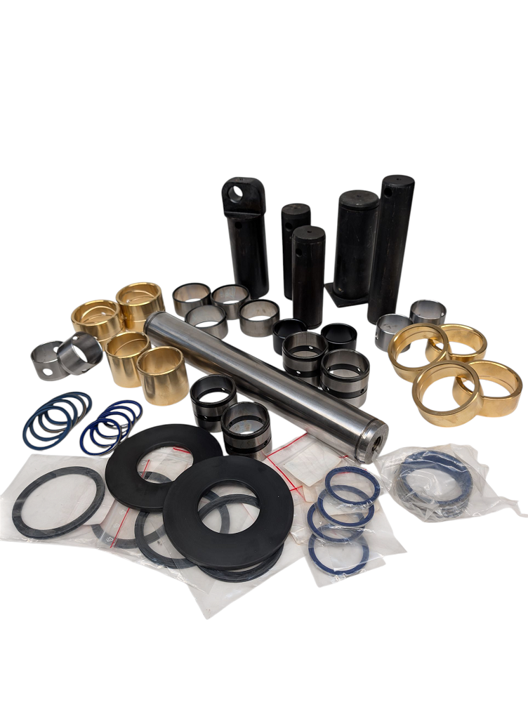 Oferujemy profesjonalny, kompletny zestaw naprawczy zawierający wszystkie niezbędne elementy. To kompleksowe rozwiązanie, które pozwala na pełną regenerację całego zespołu konika – od mocowania do ramy, przez siłowniki obrotu, aż po sworzeń główny ramienia.